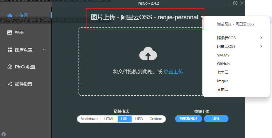 最佳图片上传工具picgo 发布于: 2026-01-12 更新于: 2026-01-12 分类于: 阅读次数: 分享到 微博 分享到 Twitter 分享到 Facebook 分享到 Google+ 分享到 LinkedIn 分享到 QQ 分享到 Telegram Java 一、工具介绍123PicGo 致力于将图片上传无缝集成到你的创作工作流中。无论你是写博客、做笔记还是编写开发文档,PicGo 都能帮你一键上传图片并自动复制链接,让你专注于内容创作本身,而不是繁琐的上传步骤。 github官网 二、操作介绍 配置图床 我这里是配置的阿里云的oss 上传区域选择对应的图床 *************感谢您的阅读************* 安装和激活pycharm2024版本